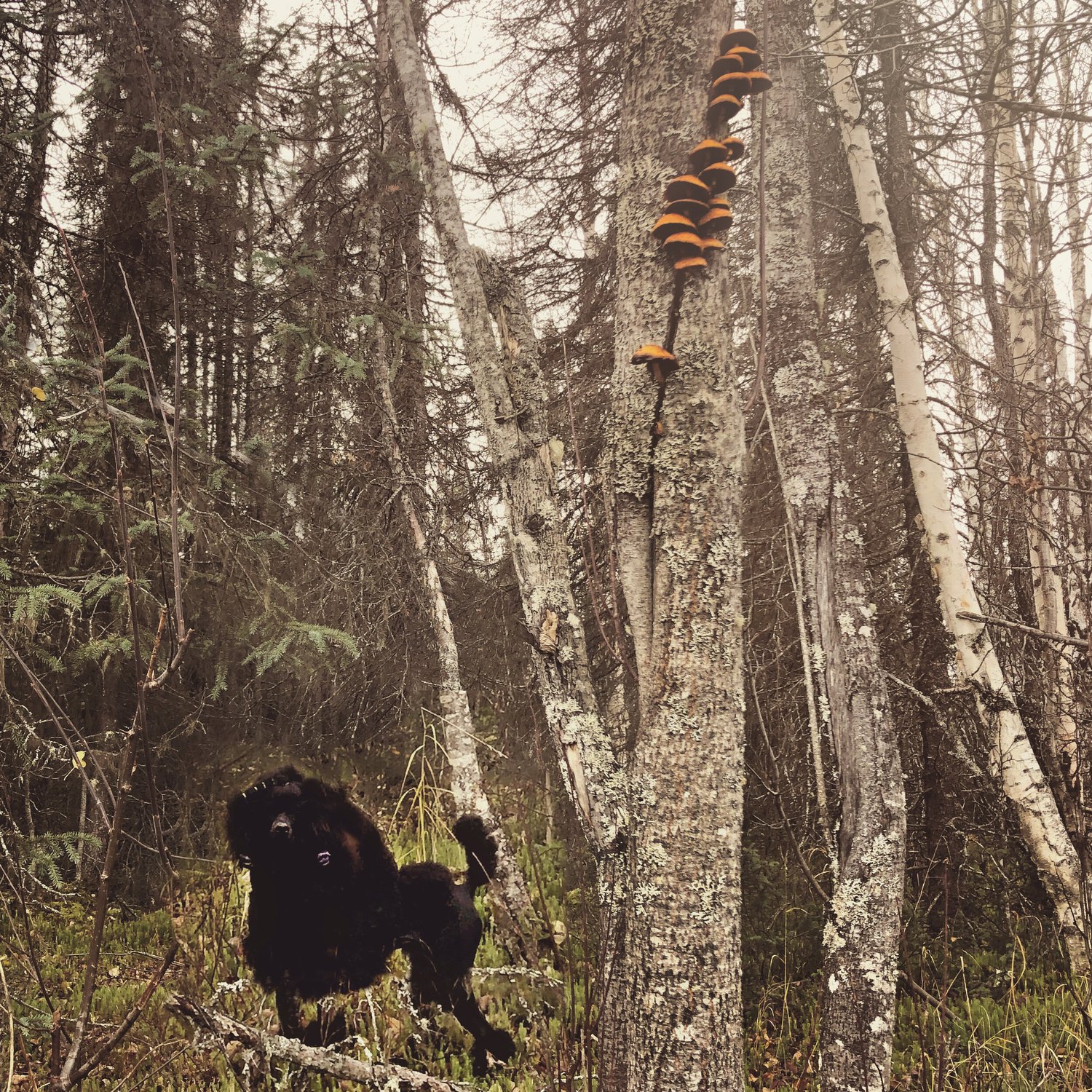 Black poodle, Kluane, walking in the woods of Talkeetna, Alaska