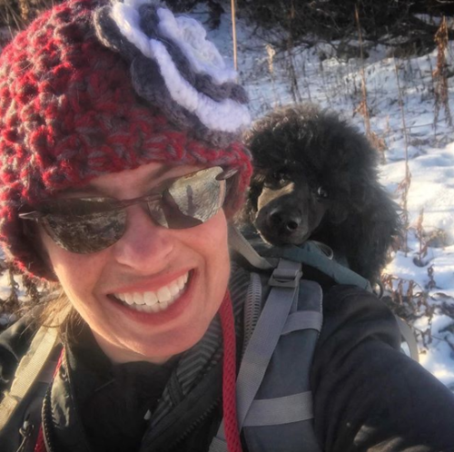 Usually 4-6 miles (6-9 km) is about all I will hike when I'm packing a puppy. I hike in to a destination about half the total miles and let the Poodle puppy out of the pack to play for a while. Usually we play for 30 minutes to an hour, depending on the age of the puppy. If my puppy is lucky enough to be a summer hiking pup, we'll stay out longer on warm days and have a picnic! But with my winter puppies, it's too cold to expose their tiny bodies to the elements for too long. Once we are finished playing at our destination, back into the pack the puppy goes and we are off on our return journey.
