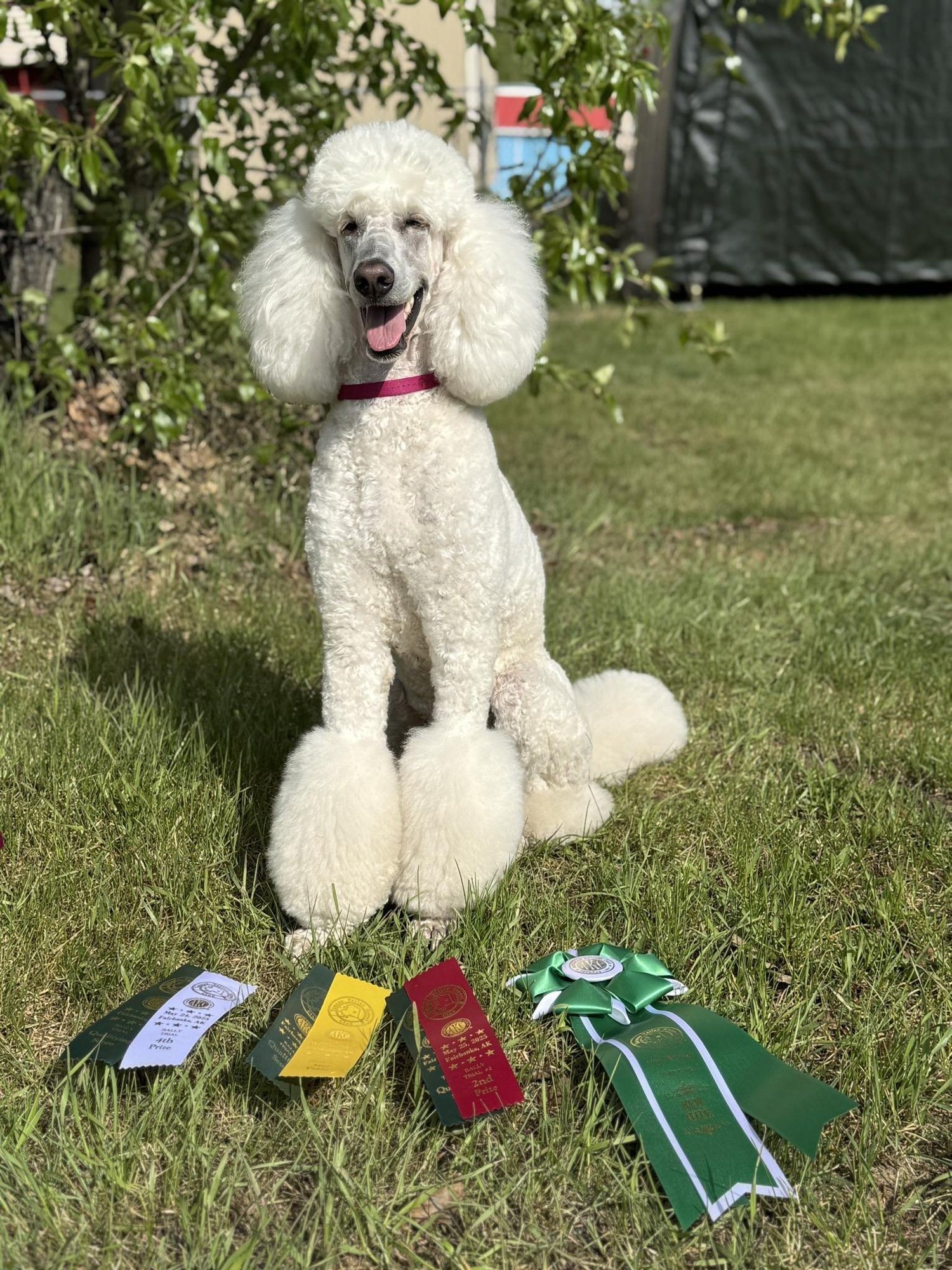 Lumi, a stunning white standard poodle from my 2022 litter, has grown into everything I hoped for and more. She’s clever, calm, athletic, and endlessly sweet — and thanks to the love and dedication of her family, she’s thriving in every sense of the word.
